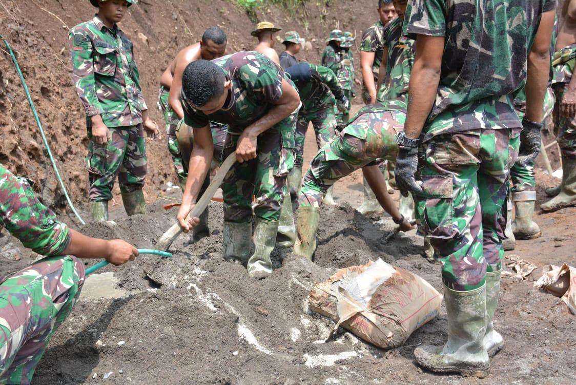 Kerja sama TNI dengan warga tampak di sepanjang jalan yang baru dibuka. Banyak warga dan para prajurit Satgas saling bahu membahu untuk percepat pembangunan plengsengan jalan.
