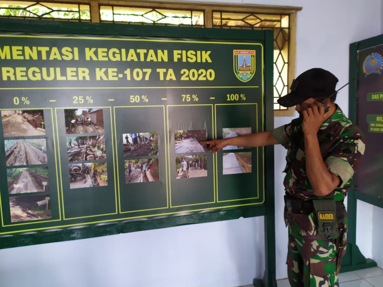 Terlintas nampak salah satu anggota Satgas TMMD yang sedang berdinas piket di kantor Posko TMMD Kodim Kudus adalah Sertu Suradi yang tengah menyampaikan laporan tentang kegiatan di sasaran fisik di Dusun Talun terdengar menyampaikan”Siap Komandan kegiatan tetap di laksanakan Satgas TMMD dengan aman dan lancar selanjutnya mohon petunjuk, “ucap Sertu Suradi dengan tegas.