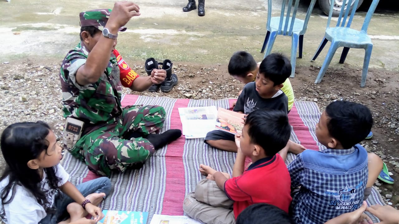 KUDUS, Jodanews.com – – Pelaksanaan TMMD Reguler 107 di Desa Kedungsari merupakan kesempatan berharga yang dapat dipergunakan Anggota Satgas Serka Jumeno dalam menjalin keakraban dengan lebih dekat dengan anak anak seusia Sekolah Dasar di Desa Kedungsari untuk berkomunikasi sosial serta berinteraksi dengan memberikan arahan,semangat,serta cerita cerita untuk memotivasinya,Sabtu (11/4/2020).