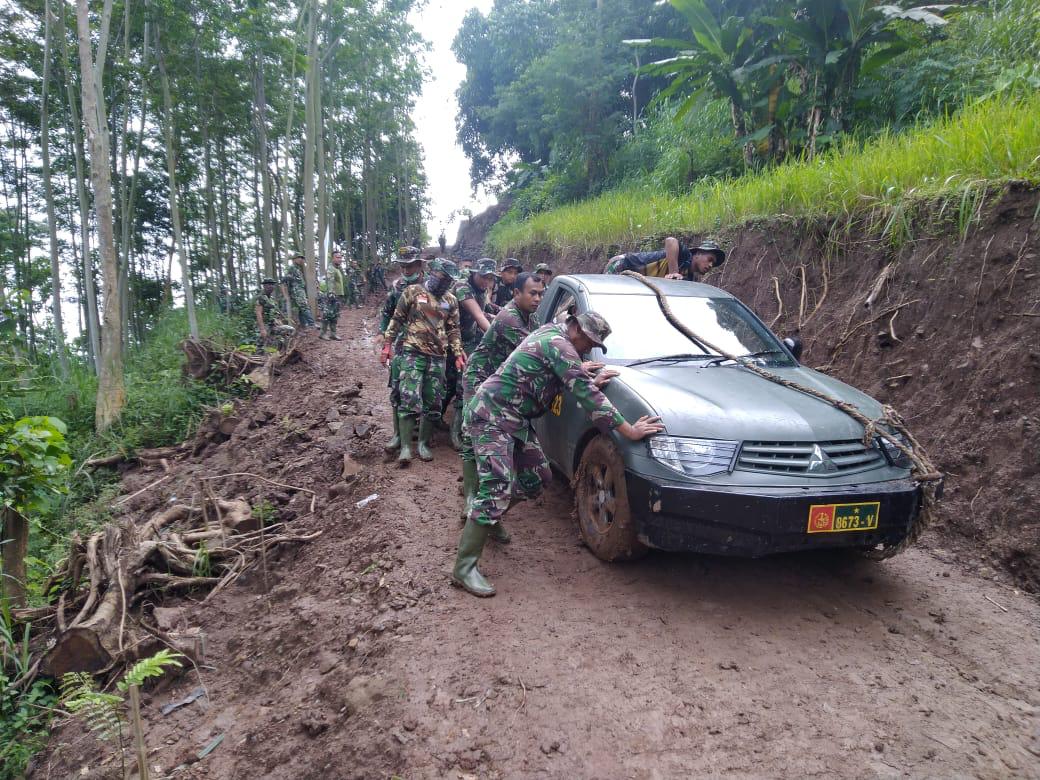 Akibatnya, kendadaan tersebut harus di dorong dan di tarik rame rame oleh personel Satgas TMMD 107 Kodim 0823 Situbondo,”Berkat kerja keras dan kerjasama tim Satgas akhirnya bisa sampai di titik nol yang jalannya sudah keras, pengiriman material ke titik 700 meter tidak boleh terlambat,”Ujar Kopda Kosin.
