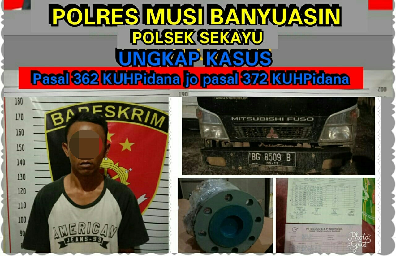 Lanjut dia, sekira Pukul 10.45 di PT. Medco Energi stasiun matra dusun IV Desa Lumpatan kec. Sekayu kab. Muba tersangka melakukan pencurian atau penggelapan setelah melakukan pengiriman barang milik Pt. Medco energi kestasiun matra, saat digudang Pt. Medco tersangka yang saat itu selaku sopir pt. Mercusuar yang bertugas untuk mengantar barang milik pt. Medco energi. Kemudian, saat hendak keluar tersangka sudah menyimpan satu buah ball valve milik pt.medco dengan menutupinya menggunakan alas barang yang terbuat dari kayu atau kayu palet. Dengan santainya, tersangka yang selesai menurunkan barang langsung meminta kepada petugas jaga gudang untuk tanda tangan terima barang, tanpa melakukan penghitungan atau pengecekan barang, penjaga gudang An. Zakaria menandatagani surat tanda terima barang tersebut,lalu tersangka pergi meninggalkan gudang pt. meco, ketika kendaraan tersangka akan keluar areal lokasi Pt. Medco petugas pos jaga memeriksa kendaraan tersangka dan ditemukan milik perusahaan, sehingga Aparat Polsek Sekayu yang telah dihubungin langsung datang dan membawanya ke mapolsek untuk di proses secara hukum.