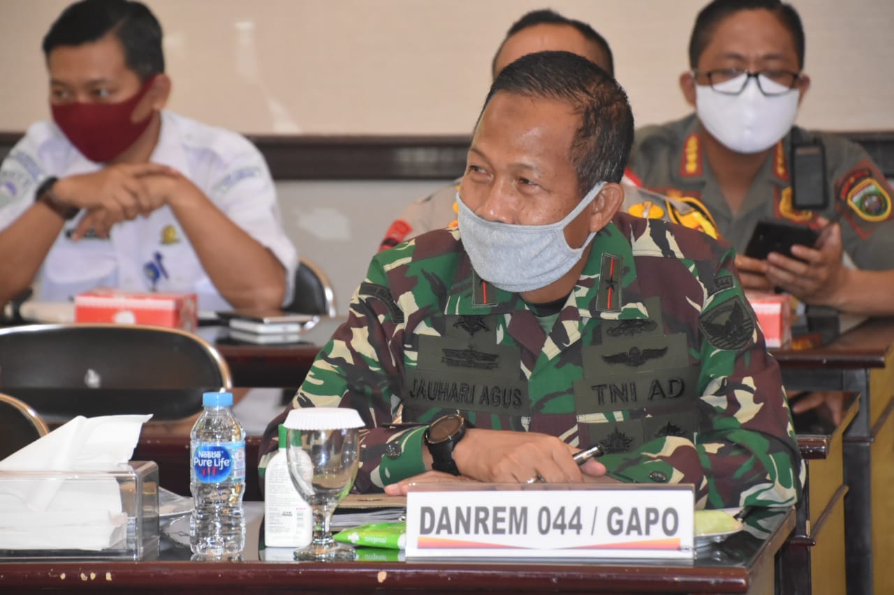 PALEMBANG, Jodanews.com – Komandan Korem (Danrem) 044/Gapo Brigjen Tni Jauhari Agus Suraji SIP SSos, hadiri Rapat Koordinasi (Rakor) penanggulangan bencana alam Kebakaran Hutan dan Lahan (Karhutla), di Ruang Catur Prasetya Mapolda Sumsel, Rabu (17/6/2020).