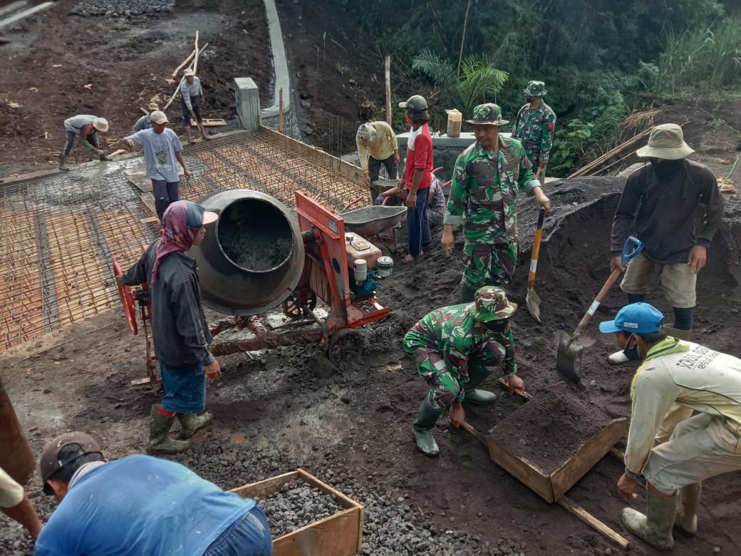 Tak henti-hentinya, para TNI dan warga yang sedang membuat adonan jenangan memasukkan bahan-bahan material berupa pasir, koral dan semen ke dalam mesin.