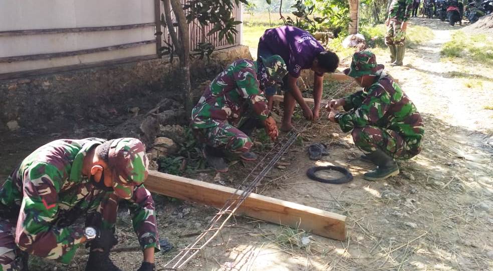Dalam persiapan rehab Mushola, tampak Sertu Rohmad, anggota Satgas TMMD yang sehari-harinya dinas di Koramil 07/Wirosari itu, bersama warga Dusun Gadon tengah merakit rangkaian yang akan digunakan untuk rangka cor tiang Mushola Al- Ikhlas