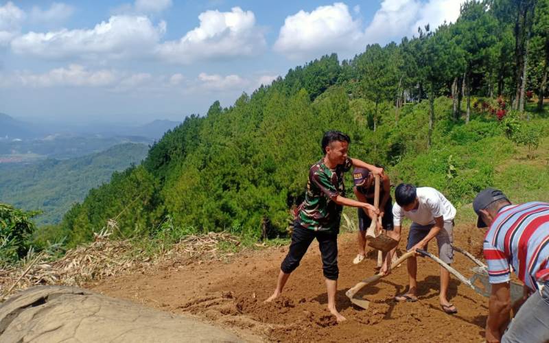 Tampak Sekdes/Carik Petahunan Sukmono (37), kaos loreng, memimpin warganya melakukan aksi nyata yaitu meratakan tanah landasan take off paralayang, yang kemarin digunakan para atlet olahraga kedirgantaraan Banyumas, untuk uji terbang selama dua hari (29-30/7). Jumat (31/7/2020).