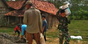 ”Lokasinya sudah tidak ada ruang untuk pergerakan gerobak atau angkong, sehingga langsir material sepenuhnya mengandalkan tenaga manusia, dengan dipanggul,” terang Serda Suparman.