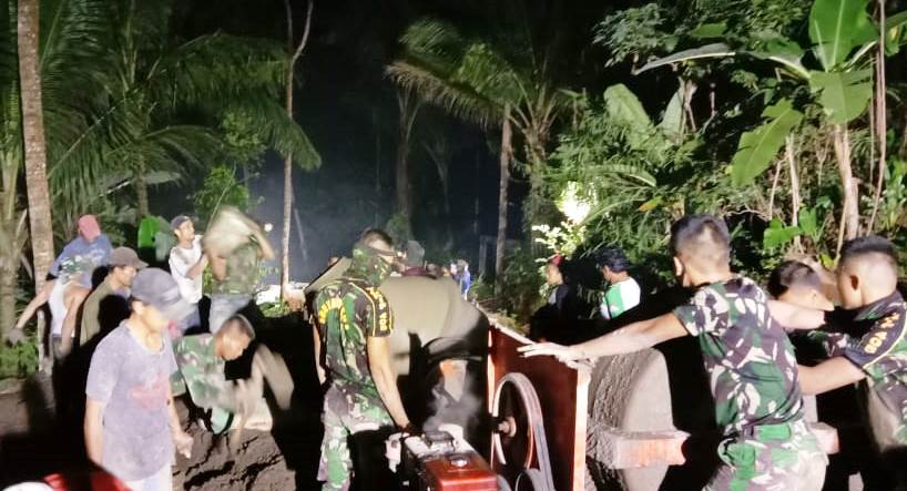BANYUMAS – Hal ini yang ditakutkan TNI dan warga saat lembur malam jalan yang merupakan salah satu sasaran fisik TMMD Reguler ke-108 Kodim 0701/Banyumas, di Desa Petahunan, Kecamatan Pekuncen, Kabupaten Banyumas, Jawa Tengah. Yakni mesin molen mogok.