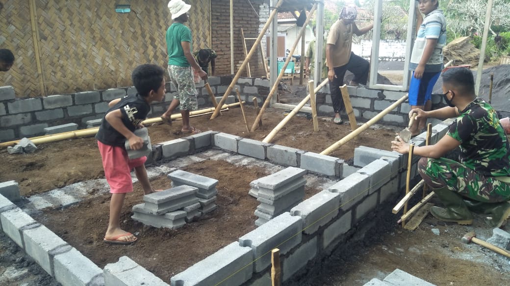 Lumajang,JodaNews.com-  TMMD 108, Nampak seorang anak berbaju hitam, bercelana merah mengangkat batako, didekat personil TNI yang kala itu sibuk meluruskan tatanan dinding.
