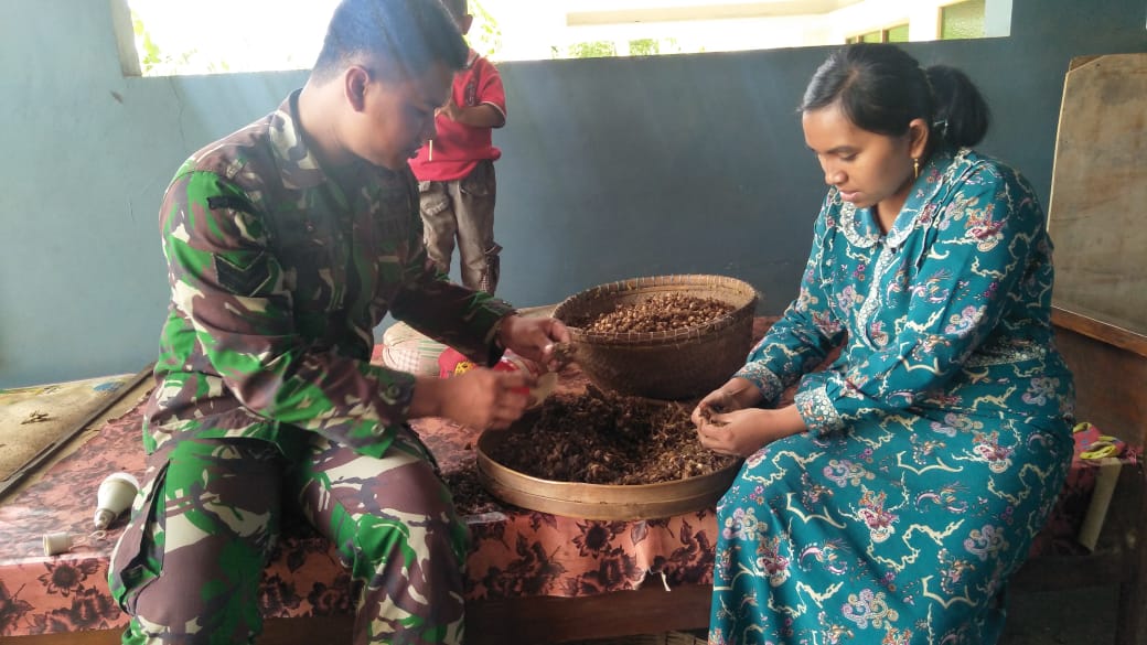 Terlihat Sertu Tomi, membantu seorang ibu warga desa Pandansari Kecamatan Senduro Kabupaten Lumajang Jawa Timur, memilah biji kapulaga.