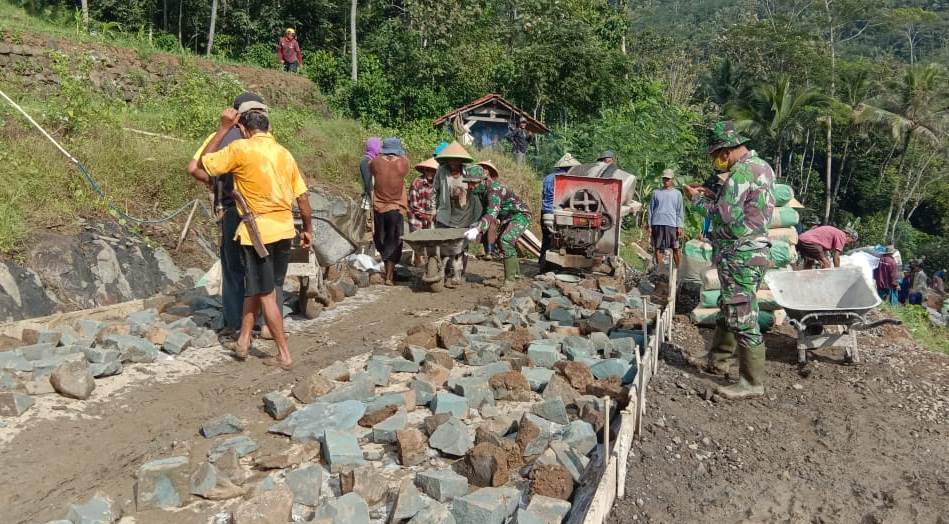 BANYUMAS – Pasiter Kodim 0701/Banyumas, Kapten Inf. Putut Widodo, jamin kualitas batu belah yang digunakan untuk ngecor jalan di Petahunan, Kecamatan Pekuncen, Kabupaten Banyumas. Begitu juga untuk jenis material lainnya.