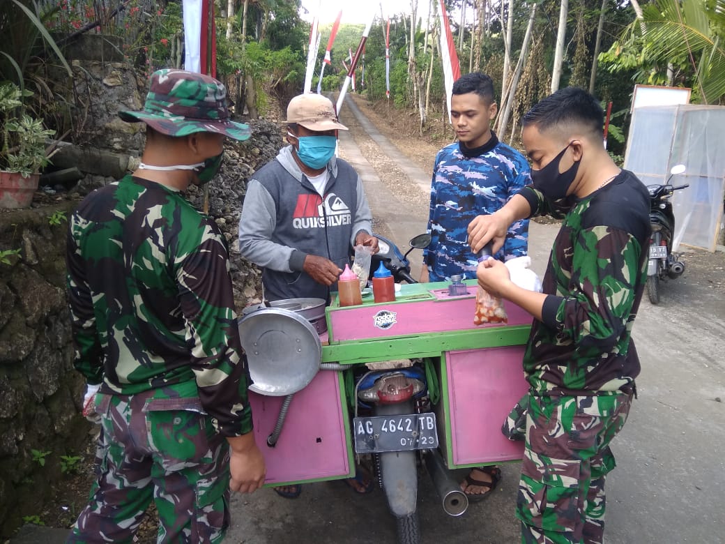 Mereka menawarkan dagangan yang dibawanya.”Saya dengar bahwa di Desa ini banyak Pak tentara. Makanya saya keliling di Desa ini untuk mencari pembeli Cilok saya,” kata Karyaji, Rabu (1/7/20).