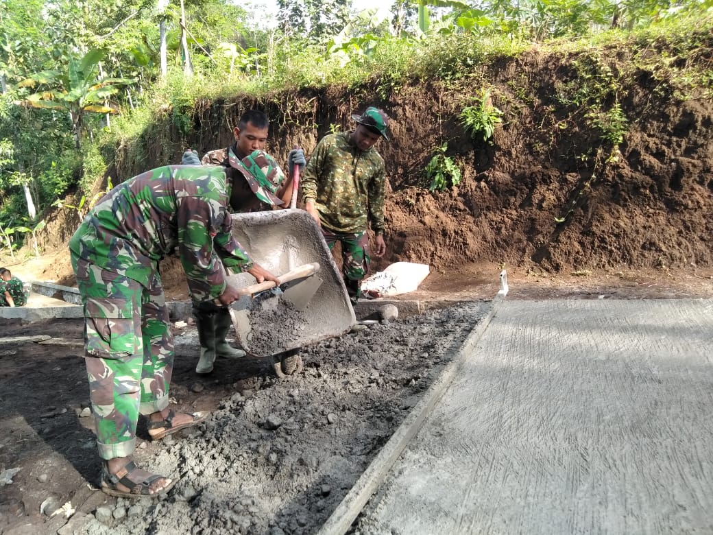 Tampak anggota Satgas TMMD dan warga langsung kebut pengecoran jalan di lokasi TMMD