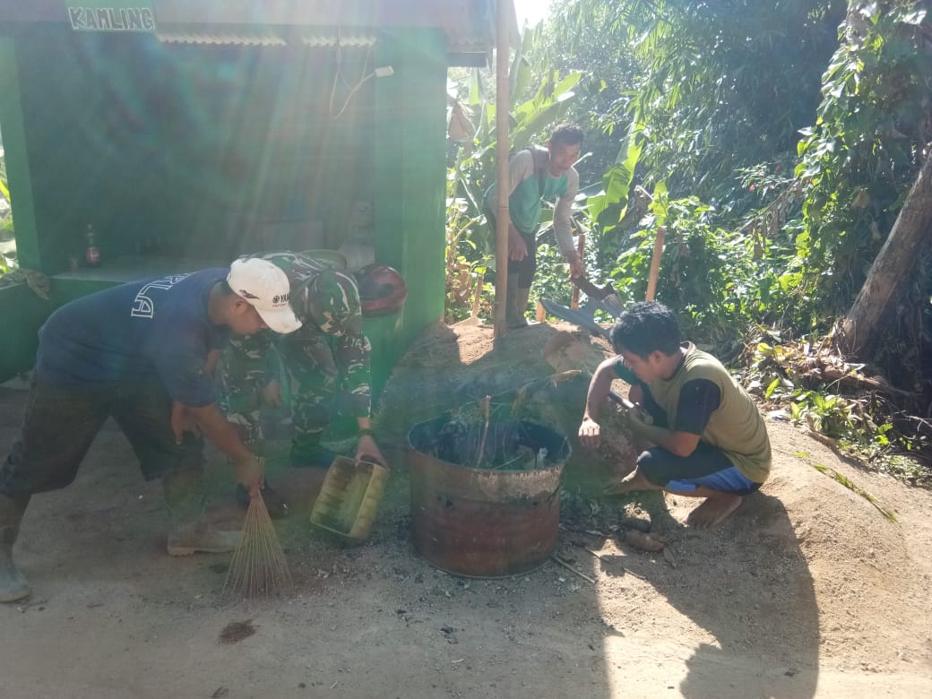 Warga begitu antusias berbaur dengan personel Satgas TMMD gotong royong membersihkan Pos Kamling.