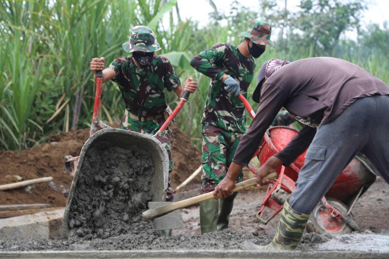 Memasuki hari ke 19 terlihat kompak Satgas TMMD dan warga meneruskan pengecoran jalan tembus dua dusun, yakni Dusun Tegal Ombo dan Dusun Gempol desa setempat.