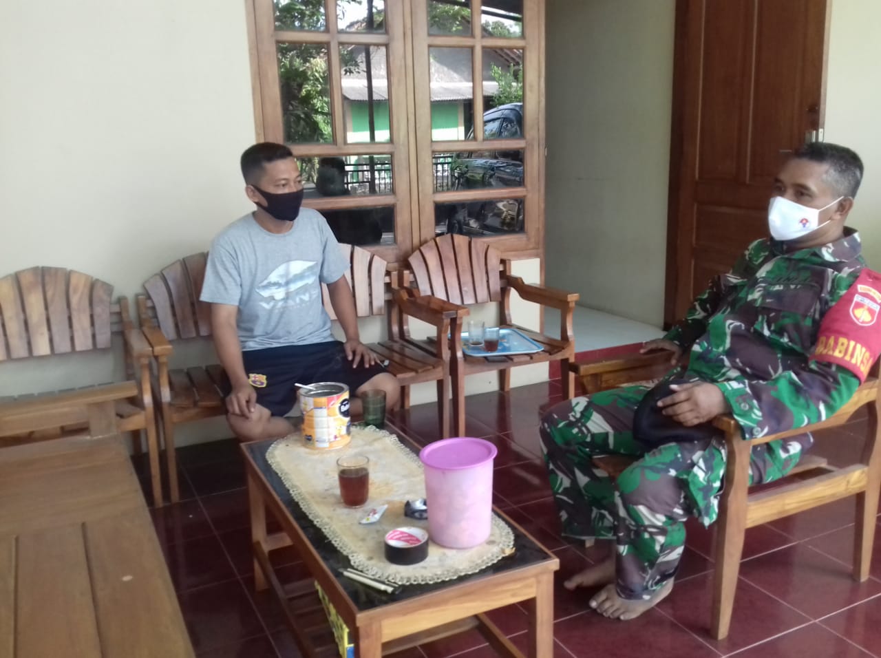 Anggota Satgas TMMD Kodim 0729/Bantul menyempatkan diri melaksanakan anjangsana ke rumah warga untuk memberikan imbauan dan informasi mengenai wabah Covid-19 yang sedang merebak. Apalagi sekarang sudah masuk dalam new normal.