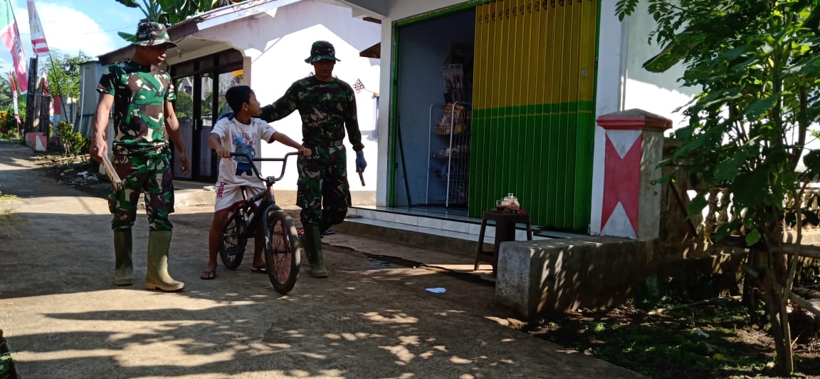 Nampak, dua personil TNI yang tergolong dalam Satgas TMMD ke 108, berjalan berdampingan dengan seorang anak di jalan desa, tepatnya di Desa Pandansari Kecamatan Senduro.