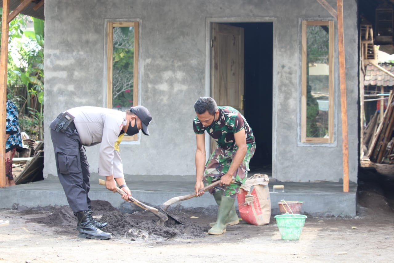 Terlihat pada gambar, anggota kepolisian sektor Senduro Lumajang, bersama dengan salah seorang prajurit TNI tergolong dalam Satgas TMMD 108, mengaduk bahan bangunan fisik.