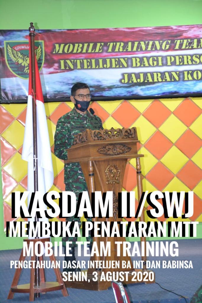 Kegiatan Mobile Training Team (MTT) Pengetahuan Dasar Intelijen yang akan berlangsung selama 12 hari, mulai tanggal 3 sampai dengan 15 Agustus 2020 ini, dibuka oleh Kasdam II/Swj, Brigjen TNI Muhammad Zamroni, Senin (3/8/2020) di Aula Markas Ajendam II/Swj, Jalan Urip Sumoharjo 2 Ilir Sekojo, Palembang.