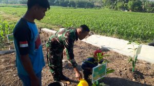 PURWODADI- Anggota Koramil 07/Wirosari Serda Suraban melaksanakan kegiatan bersama pemuda Dsn.Kenteng, Desa Tambakselo menyiram tanaman buah disekitar poskamling yang ditanam oleh Irjenad Letjen TNI Mochamad Effendi SH.MM,saat kunjungan kerja di TMMD Reg 108 Kodim 0717/Purwodadi, kemarin. Jum’at(31/07).