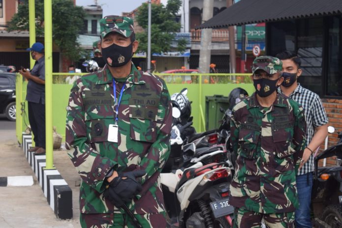 Usai apel, Danrem 044/Gapo bersama Dandim 0418/Palembang dan para pejabat lainnya, memberikan sosialisasi pencegahan penyebaran Covid-19 serta membagikan masker kepada para pedagang maupun pembeli di Pasar KM 5. (Editor Jon Heri)