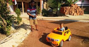 ”Lumayan mumpung jalanan masih belum boleh dilalui kendaraan, saya bisa momong cucu dengan menggunakan mobil remot. Nanti kalau jalan sudah dibuka untuk umum tentu tidak bisa lagi main, momong cucu di jalan ini,” papar Supari. (Amin09)