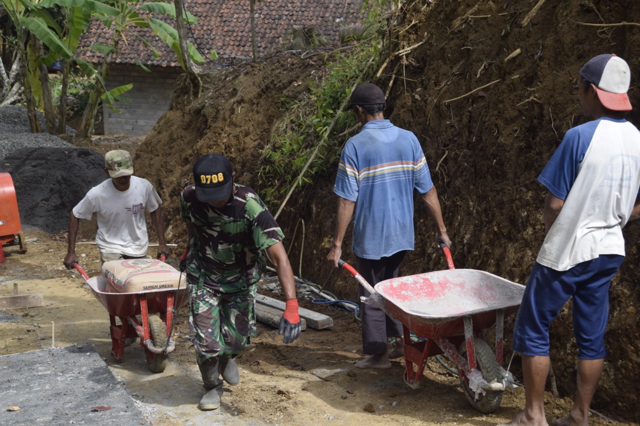 Kekuatan gerobak dorong dalam melangsir semen dan bahan material lainnya di medan yang cukup ekstrim sangat membantu satgas TMMD dalam mempercepat pembangunan rabat beton dengan lebar 4 meter dan tinggi 12 cm.