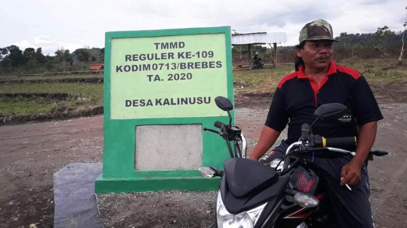 Tampak Edi (55), warga Desa Buaran, Kecamatan Bantarkawung, Kabupaten Brebes, berada di prasasti yang dibangun di titik 800 meter jalan hasil TMMD Reguler 109 Brebes sepanjang 2,2 kilometer itu. Jumat (23/10/2020).