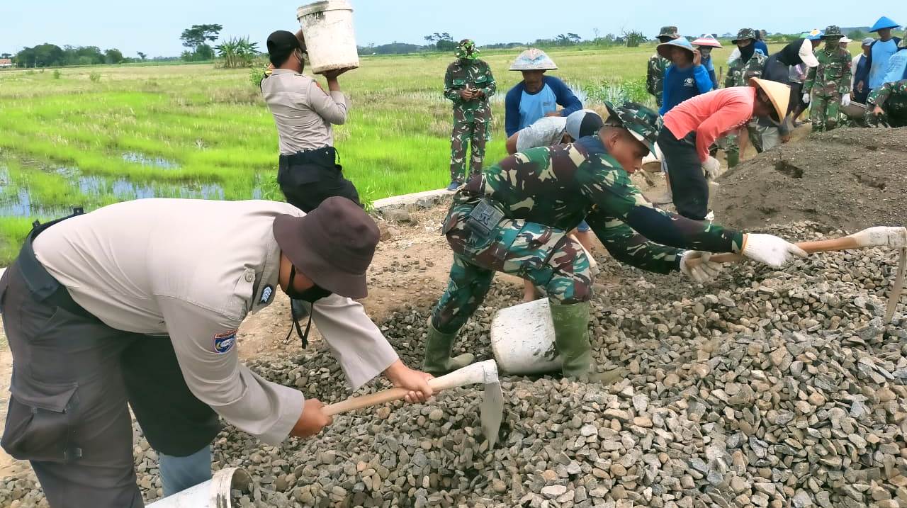 Itu terlihat saat Personil TNI dan Polri serta warga desa yang terus bahu membahu mengerjakan sasaran fisik program TMMD pengecoran jalan di Desa Sendang Kulon.