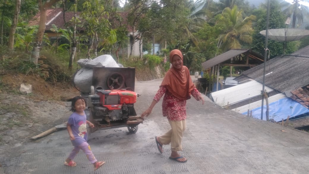 Ibu Titik (62), warga Desa Sedayu bersama cucunya terlihat sedang menikmati jalan rabat beton di dekat rumahnya.