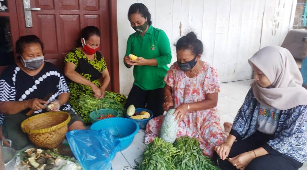 Anggota Persit Kartika Chandra Kirana (KCK) Cabang XXXVI Kodim 0715/Kendal, Ny Teguh ikut masak di dapur umum. Keberadaan Persit, tidak hanya sedang meninjau kegiatan memasak, melainkan ikut memasak dan memotong sayuran.
