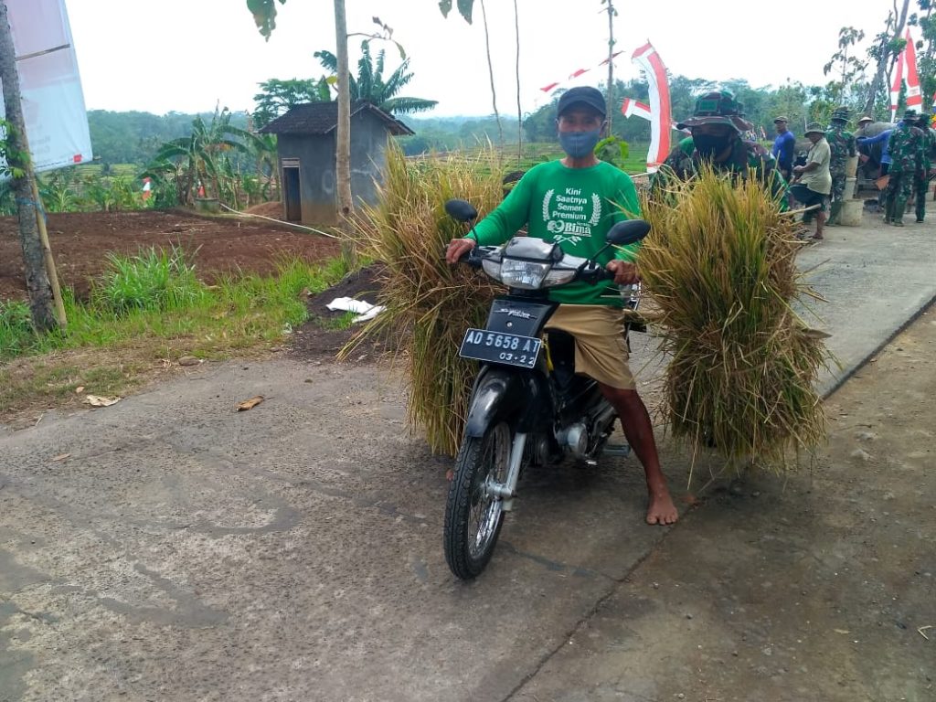 Karanganyar-Satgas TMMD Kodim 0727/Karanganyar tak henti hentinya membantu masyarakat saat motor yang membawa pakan ternak sedang mogok saat melintasi jalan baru dibangun