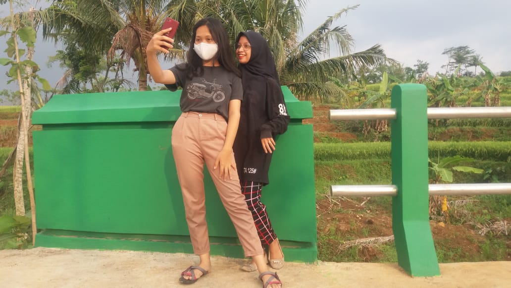 Salah satu pemudi, yakni Rani dan Ita warga Dusun Sonosari Desa Jatiwarno, mereka berdua lagi foto shelfi dengan bigron jembatan Dusun Trugo Desa Jatiwarno. Mereka bangga akses jalan pertanian dan jembatan yang ada di wilayah dusunya sudah di bangun oleh TNI.