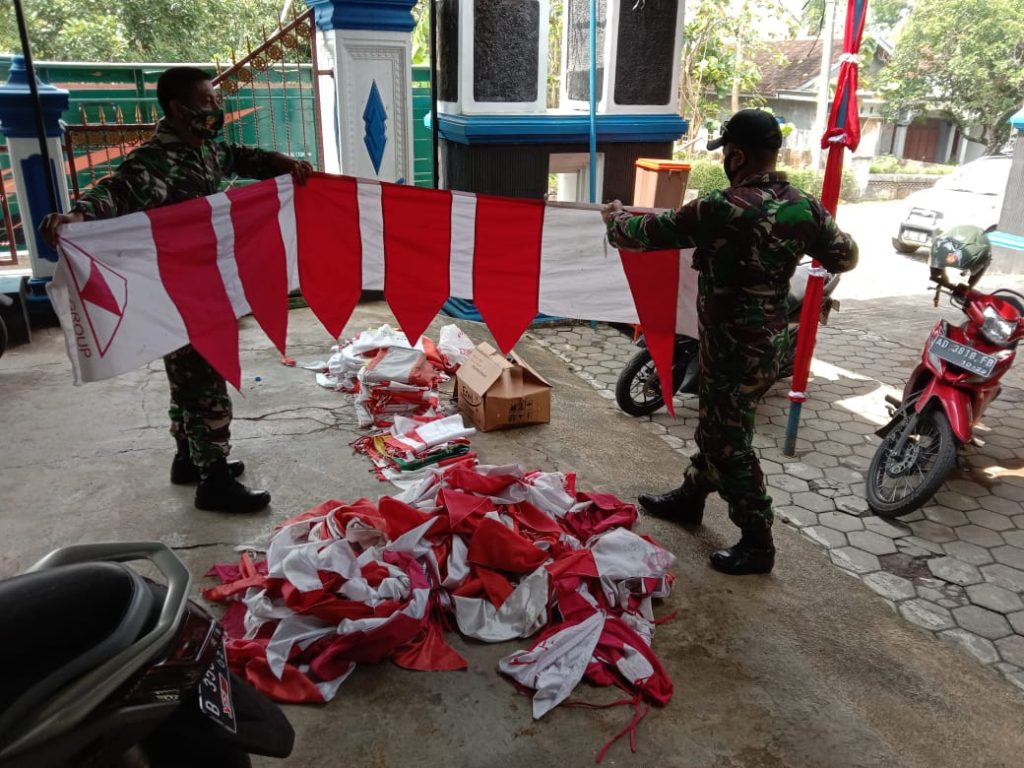 Tampak Serka Prima anggota Koramil 14 Jatipuro bersama anggota yang lain memilah dan memisahkan umbul umbul yang dipinjam dari warga dan akan dikembalikan.