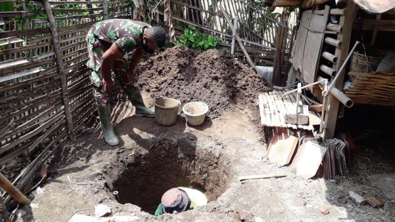 Tampak para tukang bangunan setempat dibantu anggota Satgas TMMD, sedang menggali septic tank dan juga menyiapkan bangunan MCK. Jumat (16/10/2020).