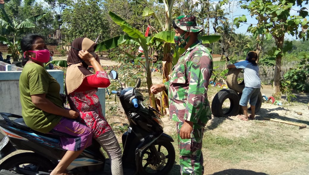 Seperti yang di lakukan Sertu Cahyono,Anggota satgas TMMD menghimbau,menegur dan memberi masker kepada pengendara sepeda motor yang tidak memakai masker supaya mematuhi anjuran pemerintah supaya memakai masker waktu keluar rumah.