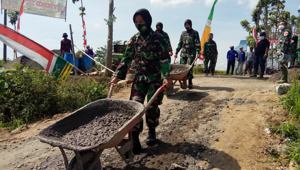 Karanganyar-Jangan remehkan srikandi-srikandi Korem Warastratama ini,mereka tak segan bermandikan keringat berbaur bersama satgas TMMD dan warga di gelaran TMMD Reguler ke 109 Kodim 0727/Karanganyar di desa Jatiwarno,memasuki hari ke 20.Pemandangan ini lain dari hari-hari sebelumnya,kehadiran Srikandi Warastratama ikut turun langsung di sasaran fisik TMMD Reguler 109 Karanganyar.