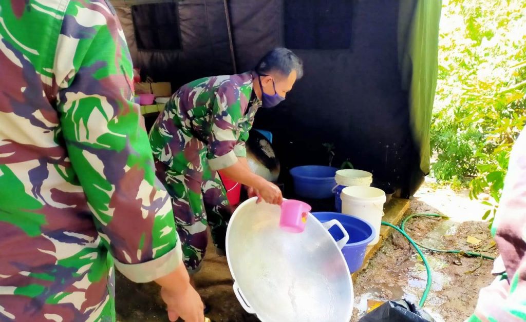 “Kebersihan pun harus tetap terjaga, kebersihan peralatan dapur, kebersihan lokasi dapur dan bahan mentah siap olah pun harus dalam keadaan bersih. Karena kebersihan merupakan sebagian dari iman, maka kita tim Satgas dapur lapangan wajib menerapkan selalu bersih sebelum dan sesudah memasak”, tegas Pelda Karmin(AL)