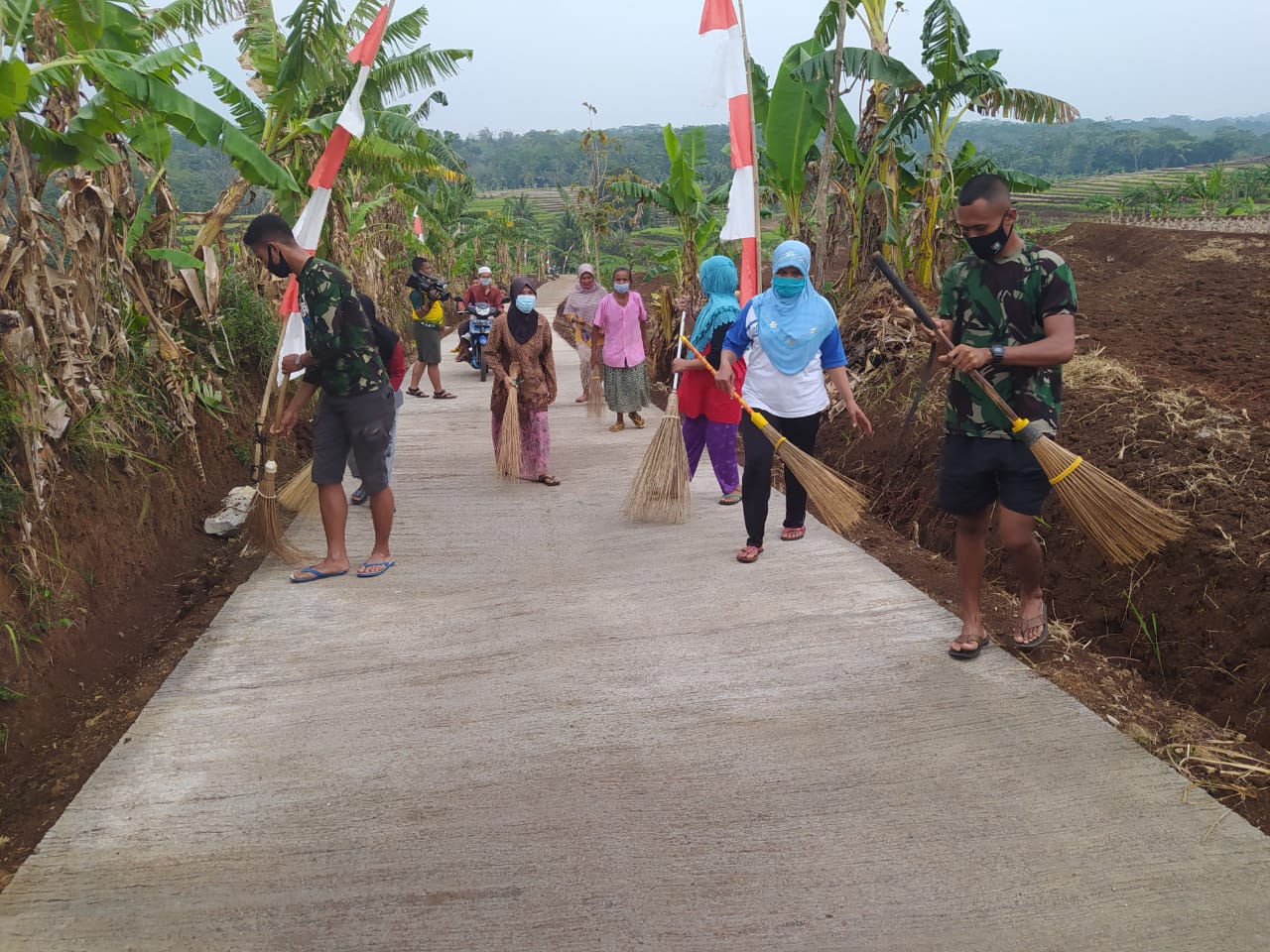 Tampak Anggota Satgas TMMD Reguler 109 bersama warga bahu membahu bergantian menyapu jalan baru yang menghubungkan Dusun Trugo dan Dusun Sonosari.