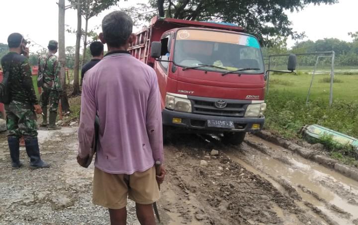 Nampak dilokasi, Babinsa Desa Ngrancang, Koptu Mukti, bersama warga sekitar memantau jalan penghubung dua desa tersebut kondisinya saat ini sangat cukup memprihatinkan.