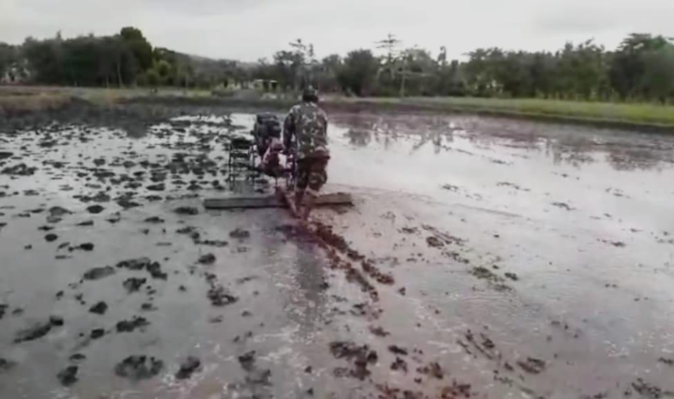 Nampak, personel Satgas TMMD ke- 110 Kodim Bojonegoro, menyempatkan diri membantu pengolahan lahan pertanian milik salah satu warga yang ada di Desa Ngrancang. “Di sela-sela kegiatan TMMD anggota Satgas membantu melakukan pengolahan atau membajak tanah pertanian milik Radi,” jelasnya.