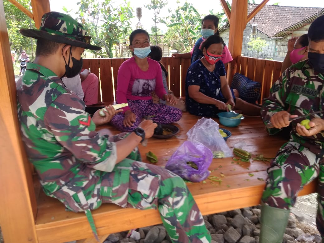 Anggota satgas TMMD ke-110 Kodim 0813/Bojonegoro Sertu Agus Rahmad dan kopda Anang beserta ibu-ibu mengupas buah untuk pembuatan rujak di Dusun Kramanan Rt.12 Rw.06 Desa Jatimulyo.