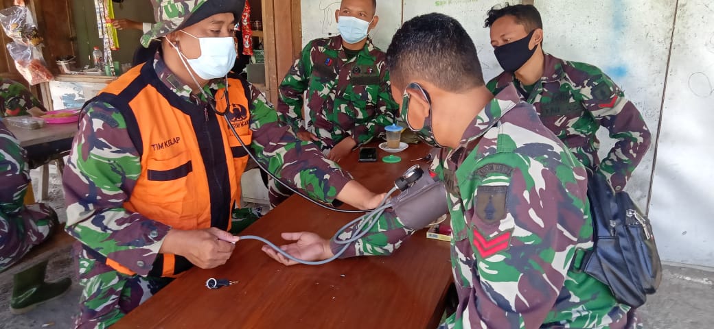 Peltu Zaenal petugas dari Polkes Denkesyah Mojokerto melakukan pengecekan kesehatan kepada personel Satgas TMMD yang mengalami keluhan, sehingga bisa segera diberi penanganan awal.