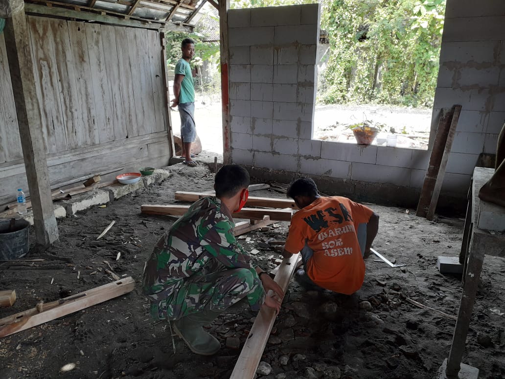 Sertu Edi anggota satgas TMMD ke-110 bersama tukang kayu sedang melakukan pembuatan jendela kusen dirumah warga Desa Ngrancang, Kecamatan Tambakrejo, Kabupaten Bojonegoro. Sedangkan untuk progress pengerjaan aladin di rumah pak Samadhon sudah hampir selesai.