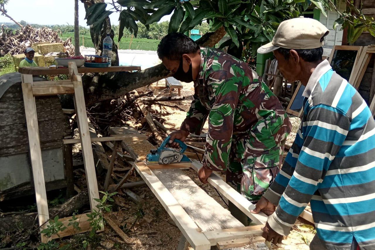 Nampak hari ini, salah satu Tim Satgas TMMD Bojonegoro, Serda Agung membantu pasang membuat Daun Jendela di rumah Pak Pasir Desa Ngrancang, Kecamatan Tambakrejo, Bojonegoro, Minggu (21/03/2021)