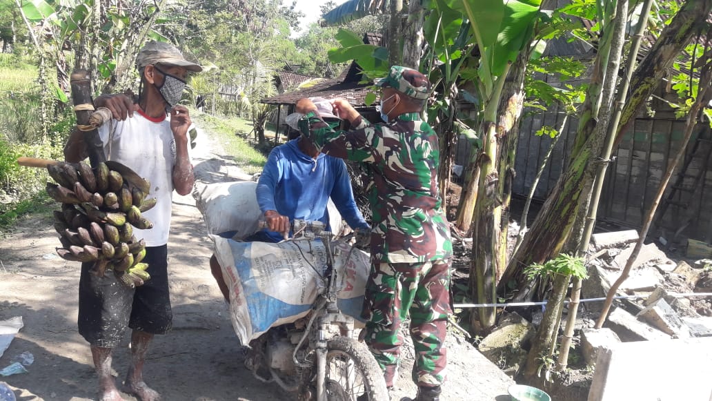 Tak hanya mengingatkan, anggota TNI juga membagikan masker kepada masyarakat pulang dari sawah di Rt.05 Rw.03 Dusun Ngglambangan.