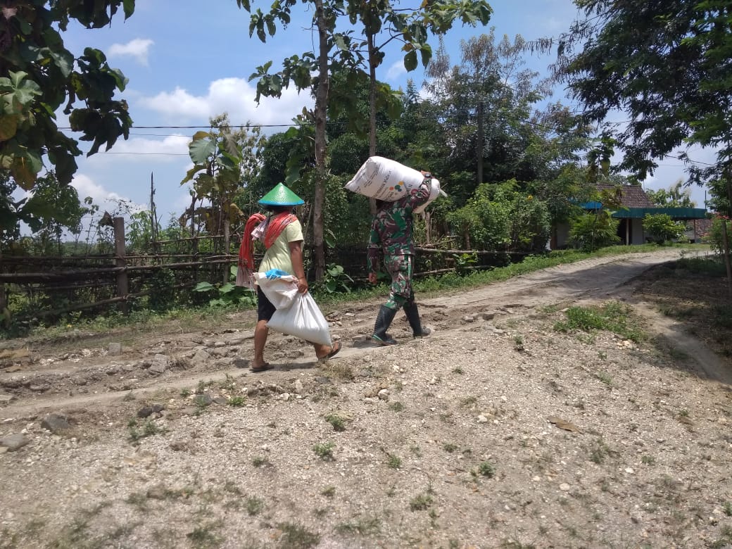 Kali ini anggota satgas TMMD ke-110 Kodim 0813/Bojonegoro Kopda Anang membantu membawakan gabah milik Ibu Martini di Dusun Kramanan Rt.12 Rw.06 Desa Jatimulyo.