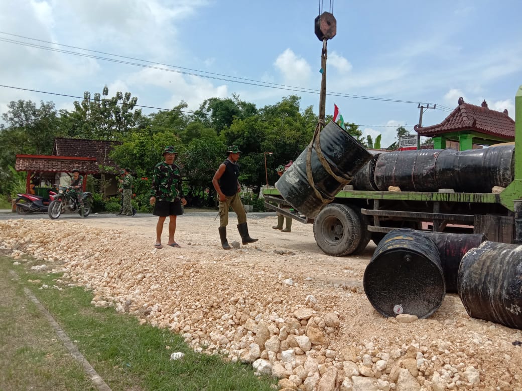 Persiapan Pengaspalan, Satgas TMMD Bojonegoro Tempatkan Aspal Di Pinggir Jalan