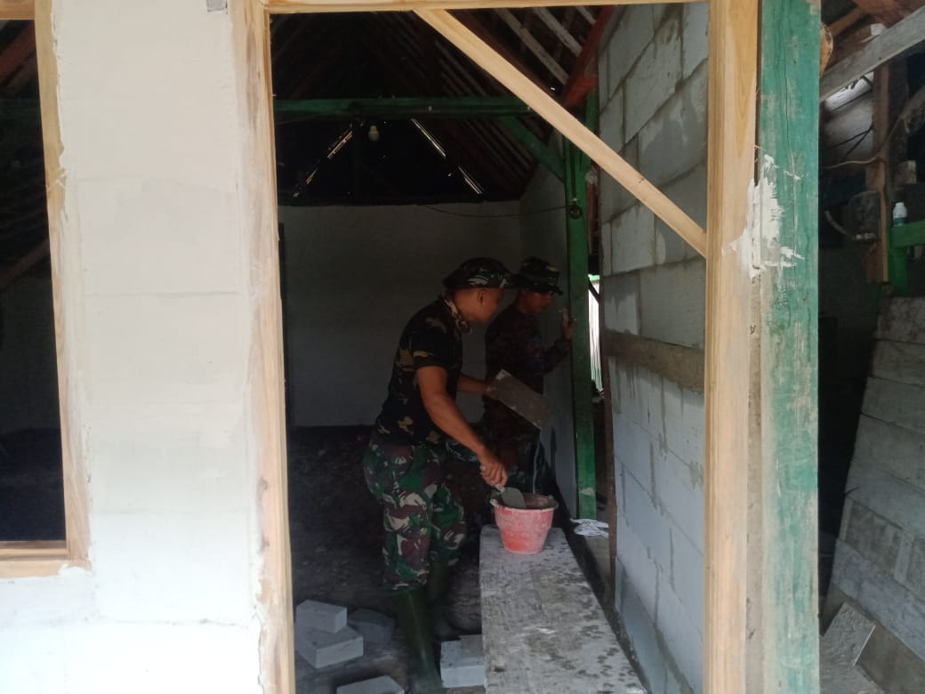 Kali ini, sejumlah anggota TMMD dengan antusias segera merampungkan proses perbaikan rumah milik seorang warga.