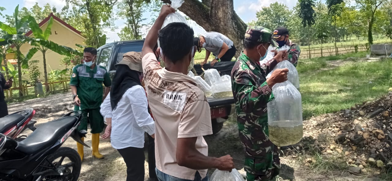Bojonegoro,jodanews.com – Satuan Tugas (Satgas) TMMD (TNI Manunggal Membangun Desa) ke-110 Kodim 0813/Bojonegoro bersama Dinas Peternakan dan Perikanan (Disnakan) Bojonegoro melaksanakan kegiatan penebaran benih ikan di perairan umum atau embung di Desa Setempat, Selasa (23/3/2021).