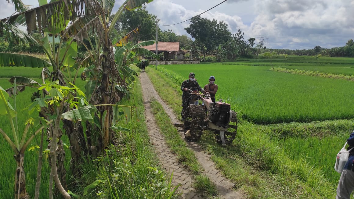 Dengan menggunakan Hand Traktor, Serda Samsuri turun kesawah bersama petani pemilik sawah untuk melakukan proses pembajakan tanah persiapan tanam padi.